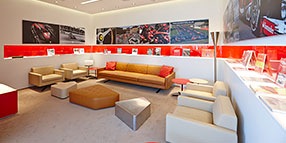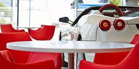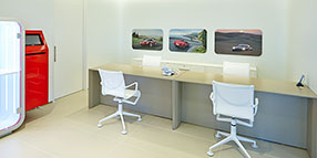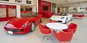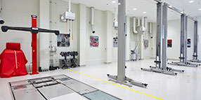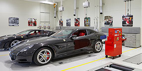 近隣にお住まいの方のみならず遠方の方々にまで幅広くご利用いただきお客様に心より満足いただくため設備面ではイタリア フェラーリ社のコンセプトに基づいた冷暖房完備の認定ワークショップに純正診断テスターを配備し最新鋭のアライメントテスターなどを含む8基のワークベイを備えております。